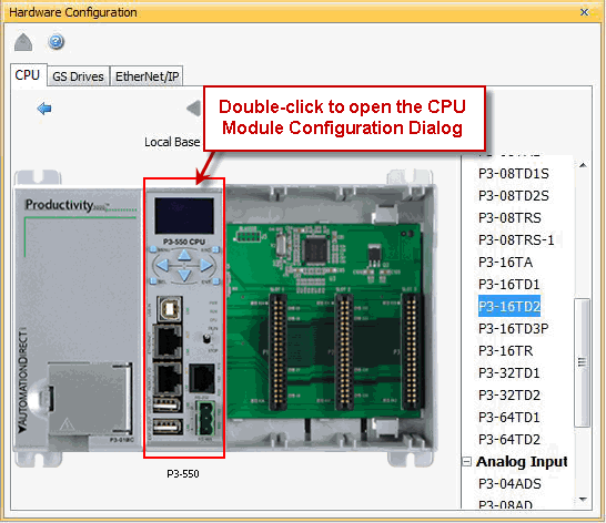 Then select the P3-550 by double left-clicking the CPU or by right-clicking the CPU and selecting Open from the drop down list. This will display the P3-550 configuration window.