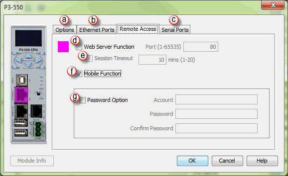 Password Option: Allows the user to set a password for Remote Access using the CPU Data App or access to the Web Server.