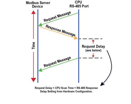 - If acting as a Client, after receiving a Modbus Response, the CPU will wait for the time period specified in this field before sending another Request. This can be used to delay request messages in order to give extra time for slow server devices.