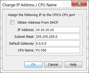 Highlight the CPU that you wish to connect to and press the “Connect” button. You may see CPUs that are not on the same subnet as your PC within the CPU Connections dialog box, but this does not mean you can connect to them. To connect to the CPU, you must configure either your PC or your CPU to be in the same subnet. You can easily change the Ethernet settings of the CPU by highlighting it and selecting the "Change CPU IP/Name" button which will open the dialog shown below. Or if you prefer, the PC Setup section contains information on configuring the Ethernet settings of your PC.
