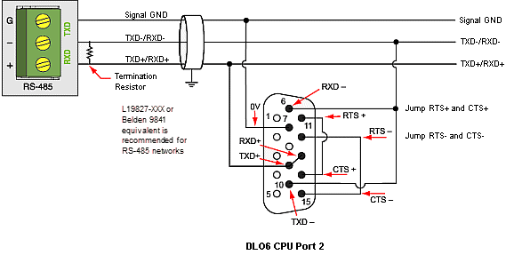 The RS-485 Port is useful for connecting multiple Modbus and ASCII devices on one network and/or connecting devices to the CPU at distances greater than 50 feet (RS-232 limit). The RS-485 standard supports distances of up to 1000 meters without requiring a repeater. The RS-485 Port on the CPU can support up to 50 devices, depending on each device’s load (this assumes a 19K Ohm load for each device). This number can be increased by placing an RS-485 repeater on the network, if necessary.