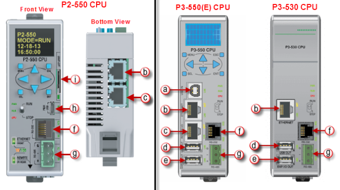 The AutomationDirect P-Series CPUs are provided with several Communications Ports, seven communications ports on the P3-550 and five communications ports on the P3-530. The Connectivity for each of these ports is described in the sections below. The Communication Ports available are: