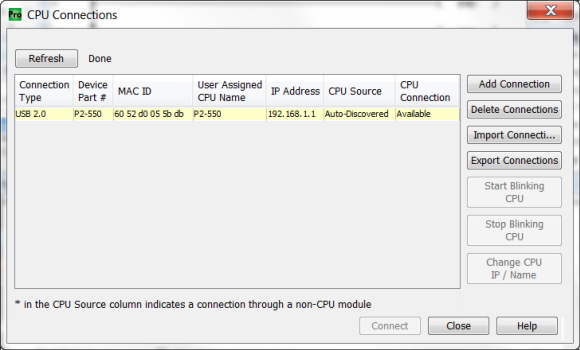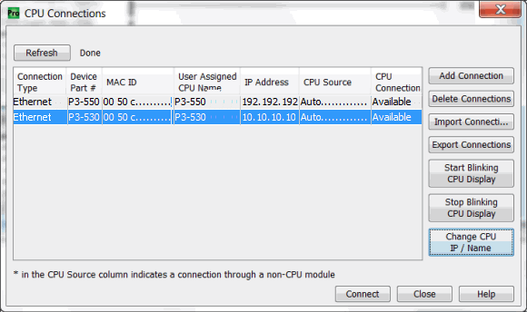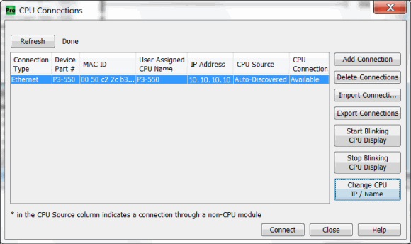 Highlight the CPU that you wish to connect to and press the “Connect” button. You may see other CPUs that are connected to your PC within the CPU Connections dialog box, but this does not mean you can connect to them.