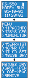 To transfer a project to or from a USB Drive on the P3-550 CPU, press Menu on the CPU display LCD and scroll down to the M8USB DRV option.