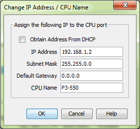 - Enter an IP Address of 192.168.1.2 and Subnet Mask 255.255.0.0 for the CPU’s network IP setting and select OK.
