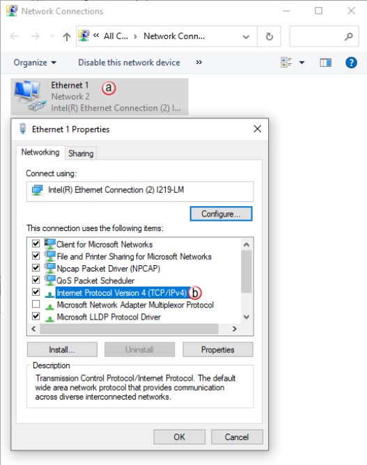 - Right click on the Network interface shown in the Network Connections dialog and select Properties. If there is more than one Network Interface on the PC, be sure to choose the one connected to the Ethernet Switch with the CPU on it.