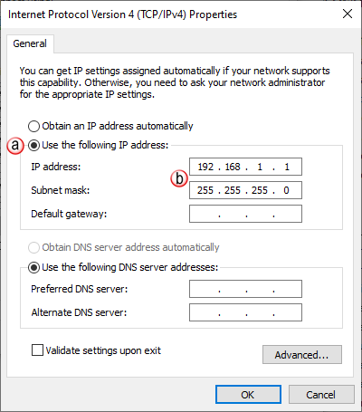 - Enter an IP Address of 192.168.1.1 and Subnet Mask 255.255.255.0 and select OK. Select OK again or Close on the Local Area Connection Properties window.