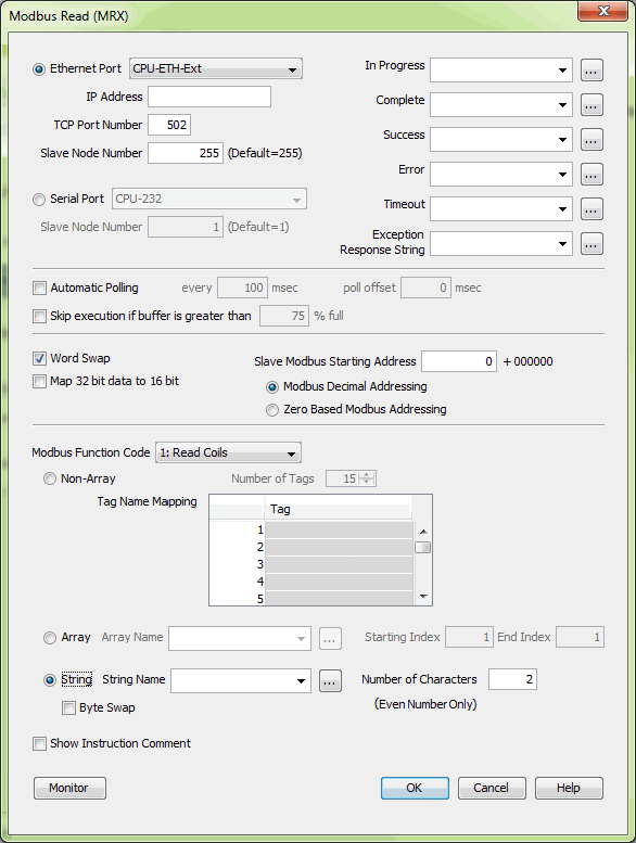 The MRX instruction can be used for Modbus TCP or Modbus RTU. There are several status bits that can be used to determine whether the read message was successful and if it was not, the reason why.