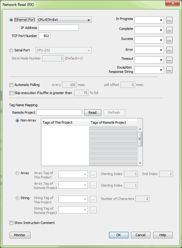 The same status bits are available in the RX instruction as in the MRX instruction and operate in the same manner. The greatest difference in the RX versus the MRX is that with the RX, the Tag Name in the target CPU can be referenced directly and does not need a corresponding Modbus address. The way this is accomplished is by mapping local and remote tagnames together within the local CPU's RX instruction. Once the instruction is set up to read a remote project, the Tags of Remote Project or Array Tags of Remote Project drop down lists will be accessible. Map the Tag of the Remote project to a Tag in the Local project to read this data.