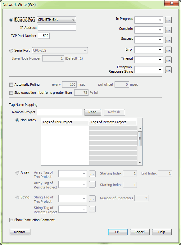 The WX instruction operates in the same manner except that the data from the Local tags will be written into the Tags of the remote project. No Modbus mapping is required.