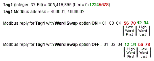 Modbus reply for Tag1 (Word Swap ON) = 01 03 04 56 78 00 00