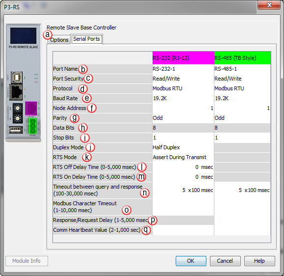 There are two Serial Ports on the P3-RS Modules. There is an RS-232 Port with an RJ-12 connector and a 2-wire RS-485 Port with a removable three point terminal block. Both Ports are capable of Modbus RTU Client (device that initiates communications requests) and Server (device that responds to communications requests) communications. They are also capable of ASCII outgoing strings and incoming strings.