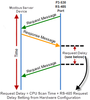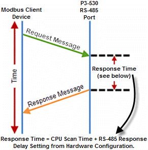 - If acting as a Server, upon receiving a Modbus Request, the CPU will wait for the time period specified in this field before sending a Response. This can be used with slow clients that need extra time to change from sending to receiving.