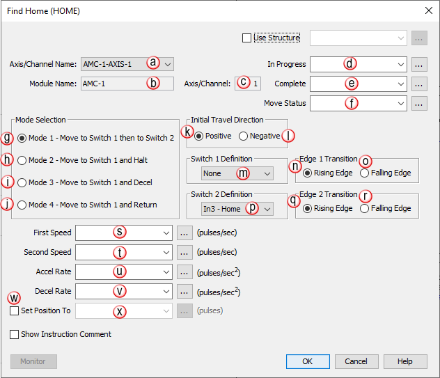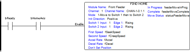 Note: All parameters are checked before the motion begins. If a move violates one of the rules, the instruction will be aborted before any motion occurs. Note: The instruction may not function correctly if the axis is being used in another instruction in ladder. If two separate instructions in ladder use the same axis, the latest one (in the scan cycle(s)) controls the axis. Instruction ConfigurationWhen the Find Home Instruction is selected, the window shown below opens with defaults shown.