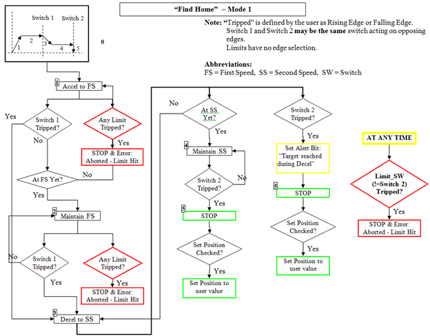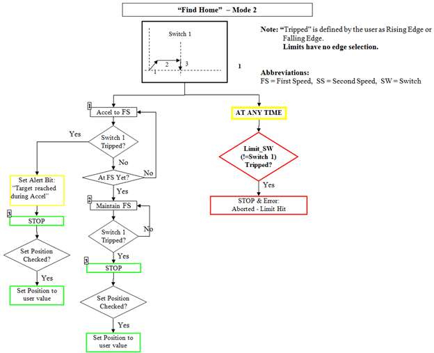 1. Accelerate to First Speed. 2. Travel at First Speed until Edge 1 of Switch 1 occurs. 3. Decelerate to a Stop. 4. Accelerate to Second Speed in the opposite direction. 4b. Travel at Second Speed until Edge 2 of Switch 1 occurs. 5. Immediately Stop and optionally set the position to a user specified value. Flow Charts