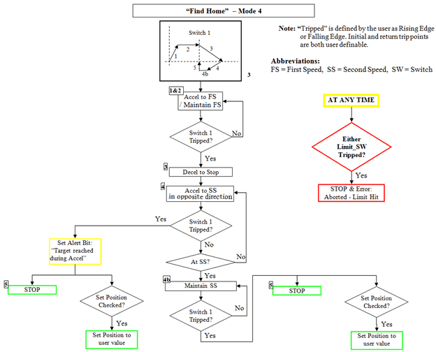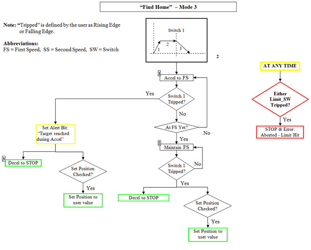 1. Accelerate to First Speed. 2. Travel at First Speed until Edge 1 of Switch 1 occurs. 3. Immediately Stop and optionally set the position to a user specified value. Mode 3Move to Switch 1 and Decelerate.