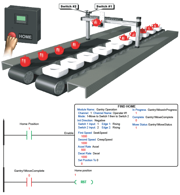 Application ExampleThe following example demonstrates how the Find Home (HOME) instruction can be utilized in a Tea Pot Pick and Place system. On power up, shutdown or any other time it may be required the Homing instruction can be executed in order to initialize or reset the system. For this example, the HOME instruction will be set to Mode 1. When the instruction is enabled, the gantry arm will accelerate to the First Speed Selection and travel at that speed until Switch #1 is triggered. The gantry arm will then decelerate to the Second Speed Selection and travel at that speed until Switch #2 is triggered. Once Switch #2 is triggered, the gantry arm will stop.