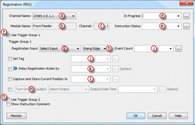 The Registration instruction can trigger several internal and external position based events. Inputs can be used to trigger the capturing of positions, setting a tag, counting events and turning on, off or pulsing an output.
