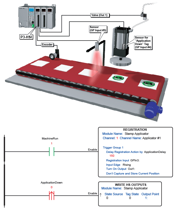 In the following example, the Registration Instruction is being used to control a pneumatic stamping system. As blank refrigerator magnets are fed onto the belt, the sensor on the in-feed end determines if the magnet is centered on the belt and, if so, triggers the Registration event. The belt mounted encoder tracks each magnet as it travels through the stamping system. The Delay Registration Action by option of the instruction allows the stamping to be delayed until the magnet is directly under the pneumatic stamp. The operation is as follows: