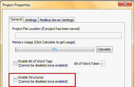 Note: If enabling Structures on a project created in an older version of the GUI, any tag previously created tag with '.' in the tag name will need to be converted. You can modify the token to a character of your choice. Example: Motor1.start will be converted to Motor1-start by default.