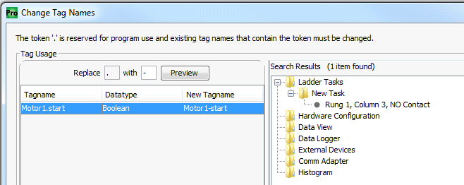 Structures are defaulted OFF for legacy projects. When enabling Structures in a legacy project with tags that have a ' . ' in the tag name (example timer.dn), you will get the Change Tag Names window as seen when enabling Bit of Word.