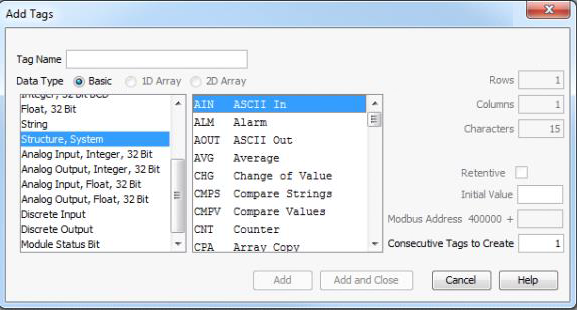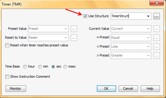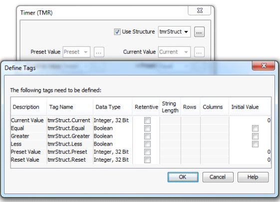 When placing an instruction into the ladder with Structures enabled, the user is allowed to assign a structure that was either previously created in the tag database or to create a new one: