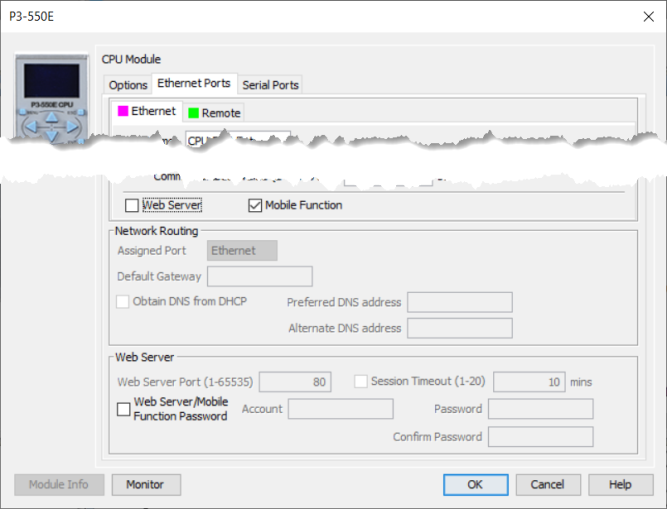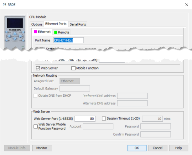 To accomplish the setup as shown above, the Productivity Series CPU Hardware Configuration setup is required and the Web Server section would be setup as shown below for the Productivity Series CPU using Port 80. For the second CPU (190.168.1.102), change the port number to 81 and for the third CPU (190.169.1.103), change the port number to 82.