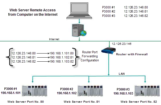 The web server port number by default is number is 80. When using a web browser such as Internet Explorer, port 80 is implied without having to type this in manually. If a number other than port 80 is needed, this can be accomplished by simply adding: <port num> after the IP Address. An example URL for the image shown below would be: 12.126.23.146. For the second processor it would be: 12.126.23.146:81 and 12.126.23.146:82 for the third processor. When configuring the router for use with the Web Server Remote Access make sure to use a TCP connection type since this is what the Web Server Remote Access uses.
