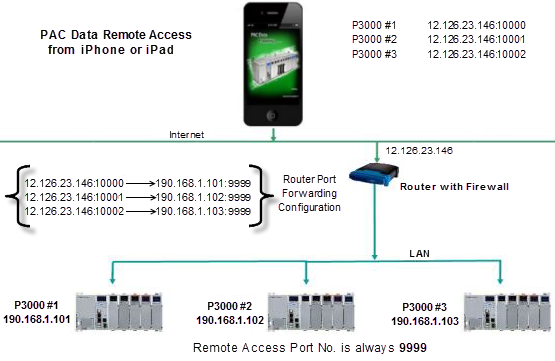 In order to access a Productivity Series CPU inside of a firewall/router remotely, a VPN connection must be used or Port forwarding must be setup in the router to allow the Web Server and Mobile Remote Access applications to get through.