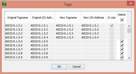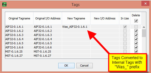 Note: Tags marked as "in use" indicate tag is currently used in ladder. If a module/address can't be converted or manually selected to not be converted the tag will be marked with a "was_" prefix.