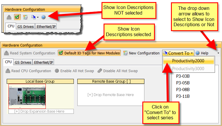 Click on the 'Convert to' option on the drop down menu in the Hardware Configuration window to access the option for converting a project between product series.