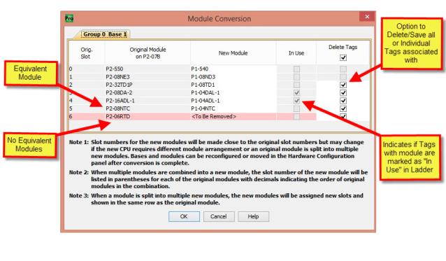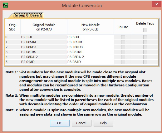Note: Slot numbers for the new modules will be made close to the original slot numbers but may change if the new CPU requires different module arrangement or an original modules split into multiple new modules. Bases and modules can be reconfigured or moved in the Hardware Configuration panel after conversion is complete.