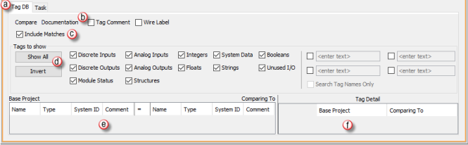 - Tags to Show: Use the check boxes across the top of the window to select which tags to display in the compare window. *Entering text in the Text Field will display tags with that text in the Name, System ID or Comment fields.