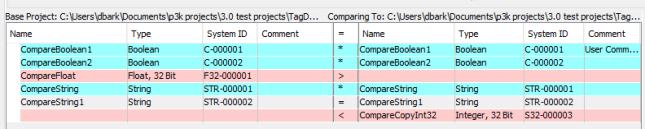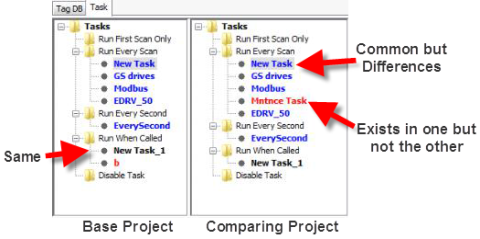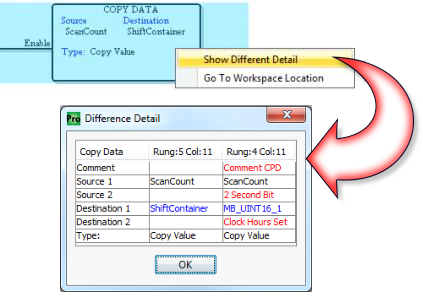 For example, you might have a ladder routine that exists in both projects, but with a rung that doesn't match, or a tag that exists, but contains different data. Double-clicking on these items brings up more detailed compare information.