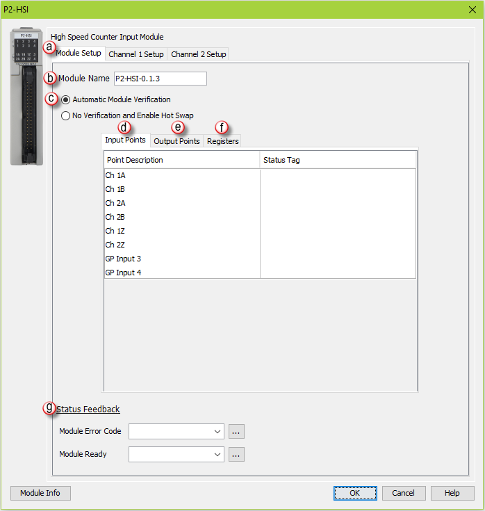 Input Points: There are two general purpose Inputs available which can be used to trigger events in the Registration instruction or used with the Inhibit Count on Input option of the module’s channel I/O configuration. Tagnames need to be assigned to these Inputs in order to be referenced from within the ladder logic. By default, inputs 1-6 are used for channel inputs but internal tags may be assigned to each point for the purpose of monitoring from within the ladder code.