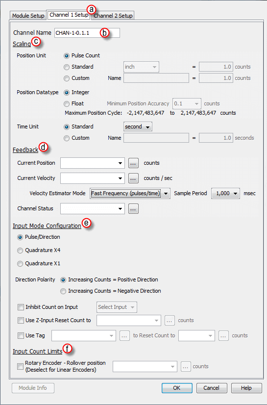 - Current Position Feedback: Insert a tag into this field in order to reference the channel’s current High-Speed Count. The value will be represented in the scaled units specified from the Channel Scaling setup.