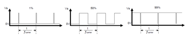 A Pulse Width Modulation (PWM) Signal is a method for generating an analog signal using a digital source. A PWM signal consists of two main components that define its behavior: a duty cycle and a frequency. The duty cycle describes the amount of time the signal is in a high (on) state as a percentage of the total time of it takes to complete one cycle. The frequency determines how fast the PWM completes a cycle (i.e. 1000 Hz would be 1000 cycles per second), and therefore how fast it switches between high and low states. By cycling a digital signal off and on at a fast enough rate, and with a certain duty cycle, the output will appear to behave like a constant voltage analog signal when providing power to devices.