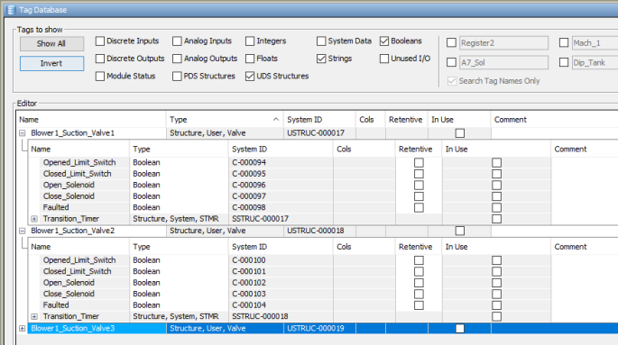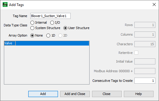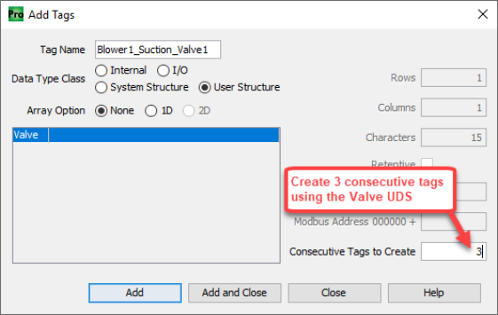The "Consecutive Tags to Create" option can be beneficial when creating Tags with User Defined Structures. In the example below Blower #2 has three Suction Valves. By naming the Tag Blower1_Suction_Valve1 and selecting 3 for Consecutive Tags to Create, Tags for all three valves are created.