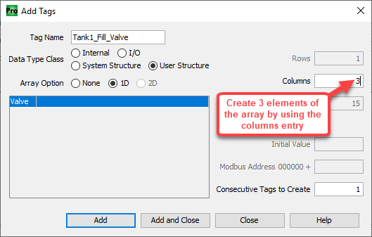 The advantage of creating an Array of UDS Tags is to provide a way to Index the Tags. In the example below, Tank1 has three Fill Valves. We enter the Tagname Tank1Fill_Valve, select UDS definition Valve, select 1D Array Option and 3 Columns.