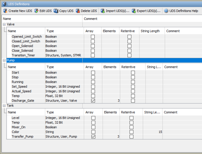 User Defined Data Types allow you to create a data structure for a particular part of your system. You can then use that data structure throughout your project. Examples of where you might use a UDS would be when you have multiple motors, pumps, or valves in a project.
