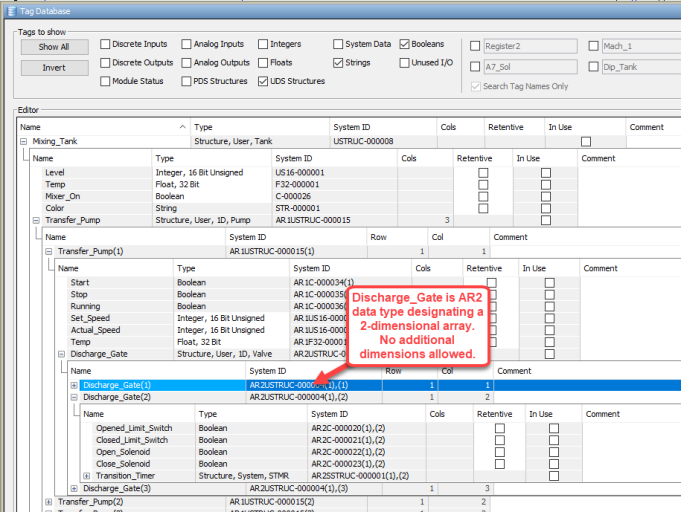 Now suppose we have a Mixing Tank with 3 Transfer Pumps. Each Transfer Pump has 3 possible Discharge Gates. We can create UDS Definitions containing arrays to make short work of configuring all the tags needed for the Mixing Tank.