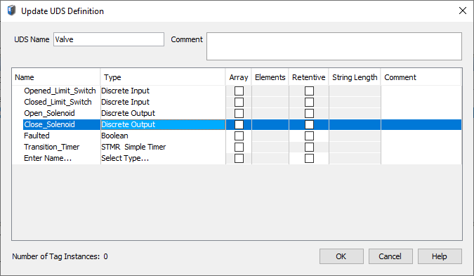In previous examples for ease of explanation we used Boolean Data Types for some UDS elements that would normally be used as Hardware I/O Data Types. In this example we will edit the UDS definition to change the Boolean elements to Discrete Inputs and Outputs.