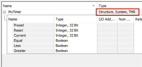 Before we get into UDSs, let’s take a look at a pre-defined Data Type that you already understand. The timer Data Type is already defined by default in a project. The timer is PREDEFINED. When you create a tag, and give it a TMR Data Type, its data structure includes the Preset, Reset, Current, Equal, Less and Greater values.