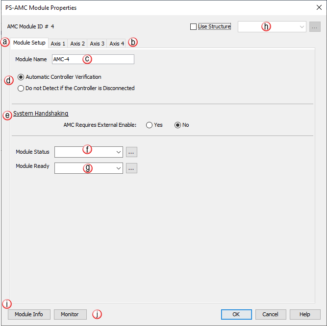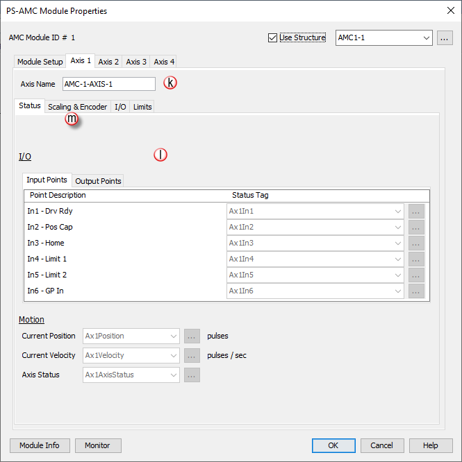 b. Axis: Access to each Axis on the AMC module (Maximum 4 axes). See details in PS-AMC Module Properties box below.