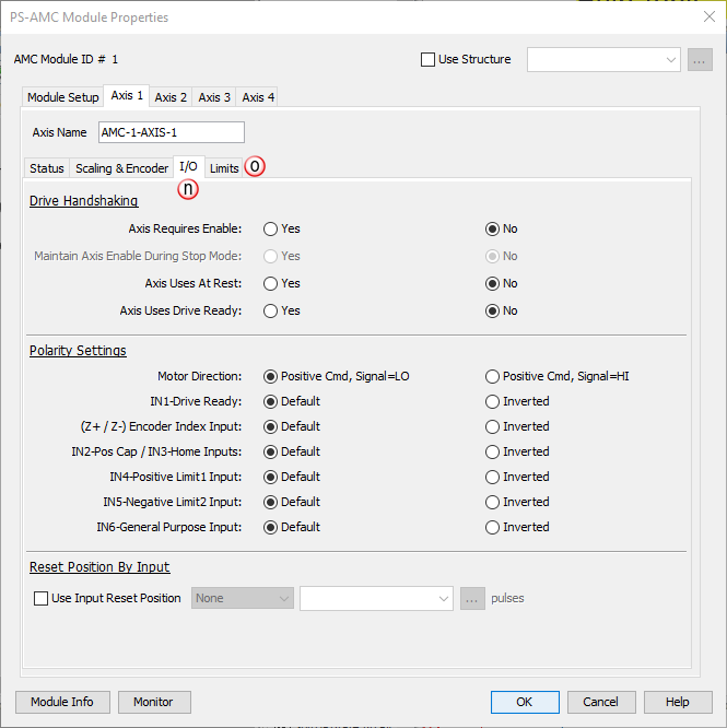 Configures settings for Drive Handshaking, Polarity Settings, and Reset Position By Input for the AMC module..