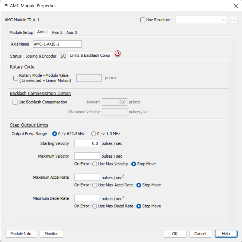 Backlash Compensation: When the direction changes, the module will output the number of pulses on the axis STP pins specified. The Current Position Feedback will not be updated with these pulses. The output will pulse at the rate specified in the Amount and Velocity fields.