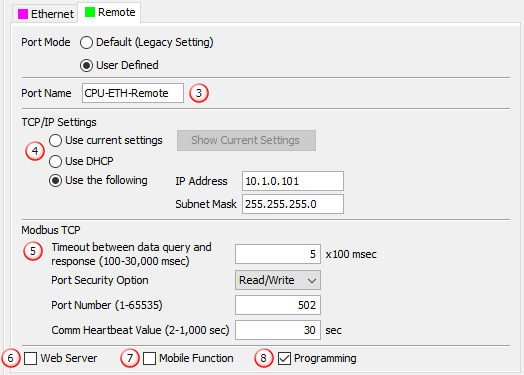 3. Port Name: Allows the entry of a unique Name for the Remote Ethernet Port. This Name is referenced in the Communications instructions (MRX, MWX, RX, WX).