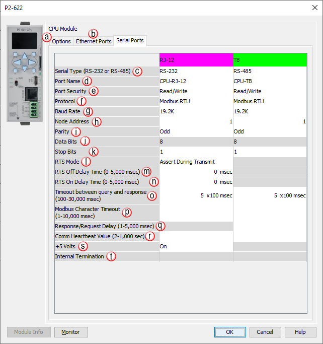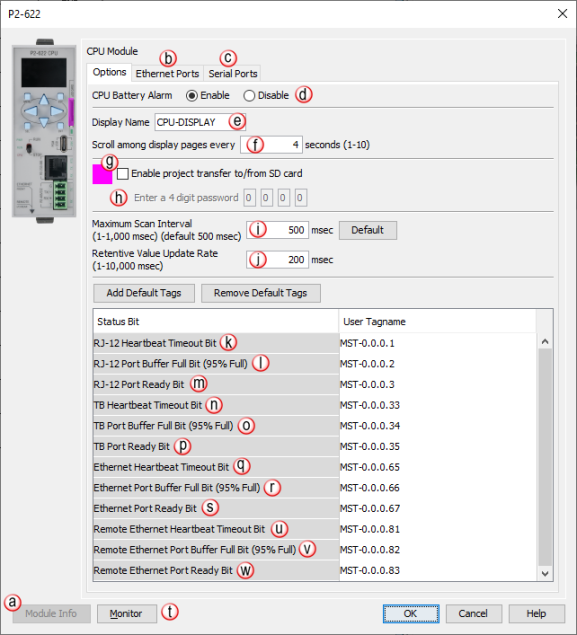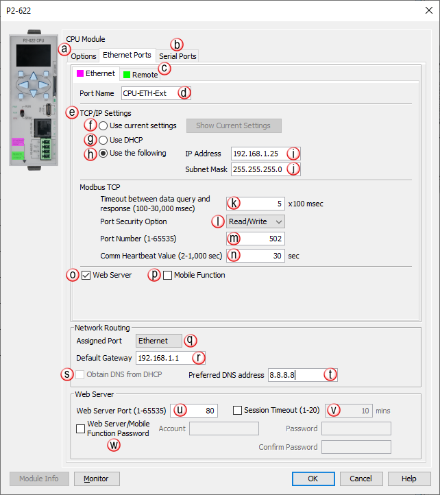 The Settings can be saved as part of the project. This must be Enabled in the P2-622 Hardware Configuration Settings by selecting Use the following (discussed on Items i, j, q, & r below). If handled this way, the Settings stored in the project will take effect at Project Transfer and at boot up only. The Settings may be changed after boot up.