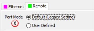 x. Port Mode: Determines whether the Remote Ethernet Port is configured as the Default (Legacy Setting) for native Remote I/O (such as remote slaves, GS Drives, Protos X groups, or AMC modules) or as User Defined.