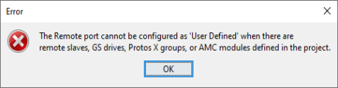 Note: Configuring the port as User Defined will disallow the configuration of remote slaves, GS Drives, Protos X groups, or AMC modules in the system. If there are remote slaves, GS Drives, Protos X groups, or AMC modules already in the system hardware configuration, the Remote Port cannot be configured as User Defined.